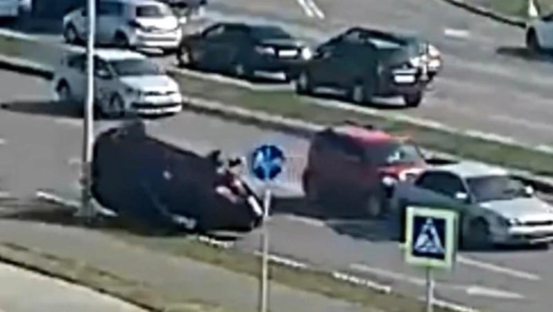 При перестроении легковой автомобиль зацепил идущую впереди машину, после чего перевернулся и богом лёг на тротуар.