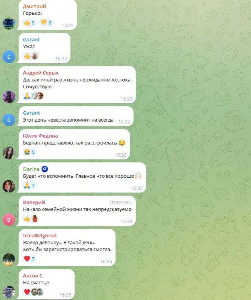 Тем временем белгородцы начали желать молодожёнам здоровья и счастья, поздравляя пусть и не совсем идеальным, но днём свадьбы. Некоторые комментаторы пошутили, что машина разбилась на счастье, а некоторые выразили надежду, на то, что невеста не сильно пострадала и не расстроилась из-за случившегося.