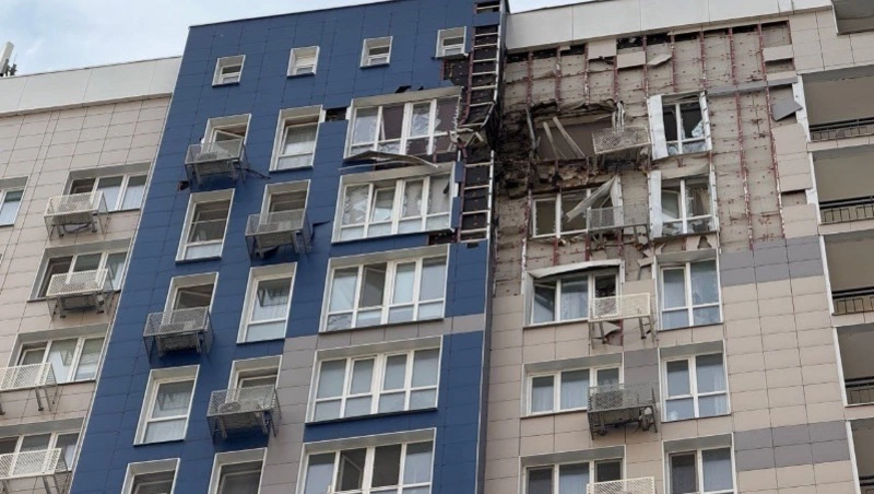 Удар пришёлся на 17-19 этажи. Повреждены десять квартир, фасад и 24 припаркованных у дома автомобиля. На месте работают оперативные службы, специалисты управы составляют акты повреждений.