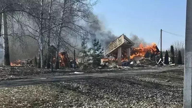 Здание социального объекта разрушено. Сгорел также коммерческий объект. Продолжается разбор конструкций. Под завалами могут оставаться люди.