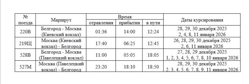 Дополнительные рейсы будут осуществляться с 26 декабря по 11 января. Пассажирам стоит учитывать время нахождения в пути. Например, состав 528В с прибытием на Павелецкий вокзал будет ехать 18 часов 05 минут. Обратная дорога из Москвы в Белгород на поезде 527М займёт 18 часов 50 минут.