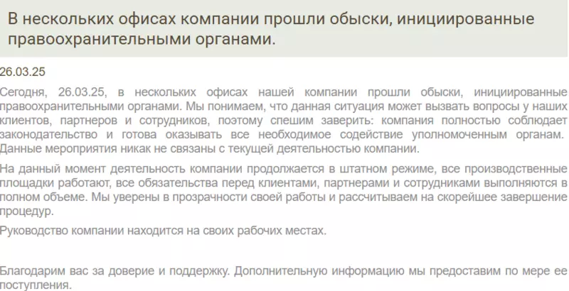 В пресс-службе компании заявили, что «Русагро» не нарушает закон. Кроме того, в сообщения сказано, что все руководство холдинга на ходится на рабочих местах, а все производственные площадки работают в штатном режиме.