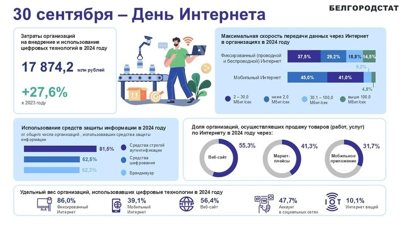 По данным статистики, в прошлом году проводной и беспроводной интернет использовали 86% исследованных организаций региона, мобильный — 39%. Всё активнее компании выходят в цифровое пространство: более половины из них имеют собственные веб-сайты, что на 5,5% больше, чем в 2023 году. При этом каждая десятая организация Белгородской области получает свыше 70% заказов через глобальную сеть.