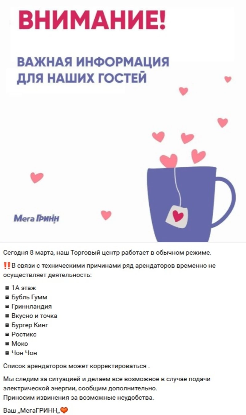 8 марта ТРЦ «МегаГринн» работает в ограниченном режиме из-за проблем с подачей электроэнергии, сообщили в пресс-службе торгового центра.
