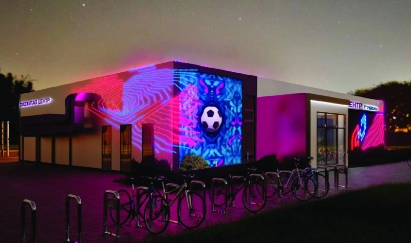 Судя по фотографиям, опубликованным главой, фасад центра будет сочетать яркие цвета, неоновую подсветку и иллюминацию. На территории учреждения будет находиться велопарковка.