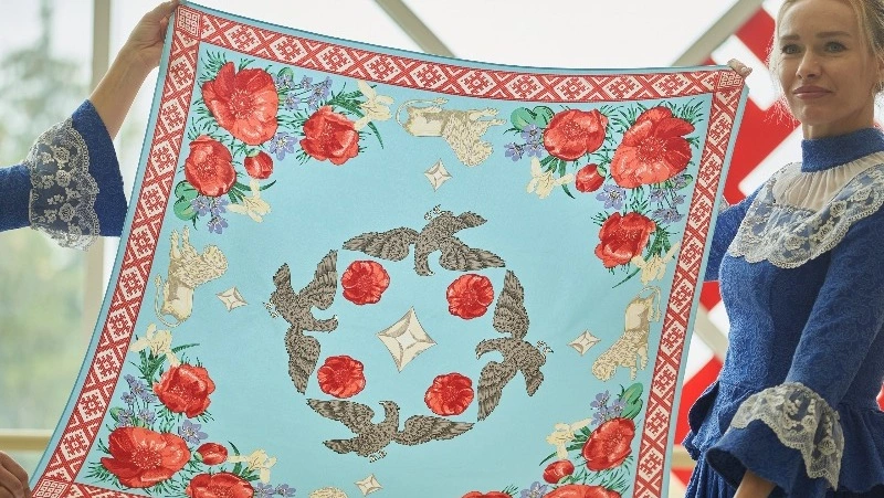 Художественное решение платка воплощает культурное наследие региона. На голубом фоне изображены геральдические фигуры орла и льва, краснокнижные растения и традиционный орнамент.