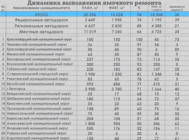 На федеральных дорогах выполнено 74% запланированного объёма: на участке в районе Ближней Алексеевки основные работы уже завершены, и далее ремонт будет идти в плановом режиме. На отрезке Бобровы Дворы — Скородное ремонт продолжается — его планируют закончить до 15 марта. В Алексеевском районе также ведутся работы, их завершение намечено на 14 марта.