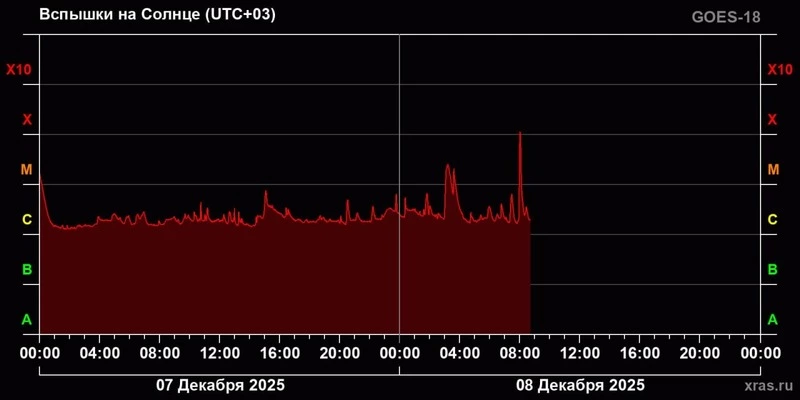 Утром 8 декабря на Солнце произошла вспышка высшего класса X 1.1 в крупнейшем солнечном пятне (область 4 298), сообщила пресс-служба лаборатории солнечной астрономии ИКИ и ИСЗФ.