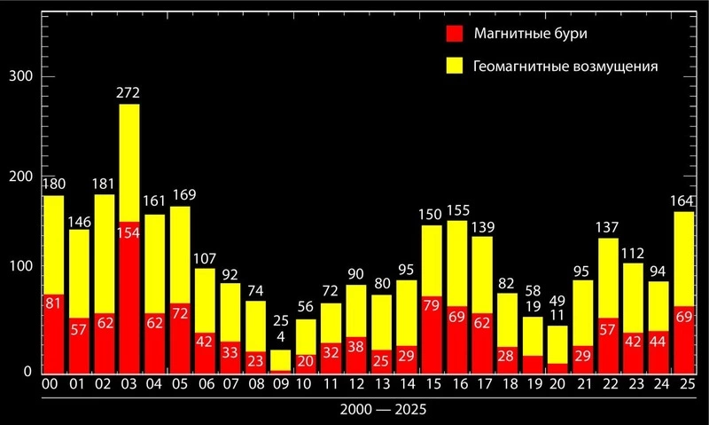 За 358 дней года магнитные бури пришлись на 69 дней, на 25 дней больше, чем годом ранее. Общее число дней с геомагнитными возмущениями жёлтого уровня и выше достигло 164, на 75% больше, чем за аналогичный период 2024 года. Большие значения по числу дней с магнитными бурями последний раз достигались в 2015 и 2016 годах, когда было зарегистрировано 79 и 69 таких дней. При этом, в лаборатории отметили, что до конца года ожидается минимум одна магнитная буря, поэтому показатели 2016 года будут ниже текущих.