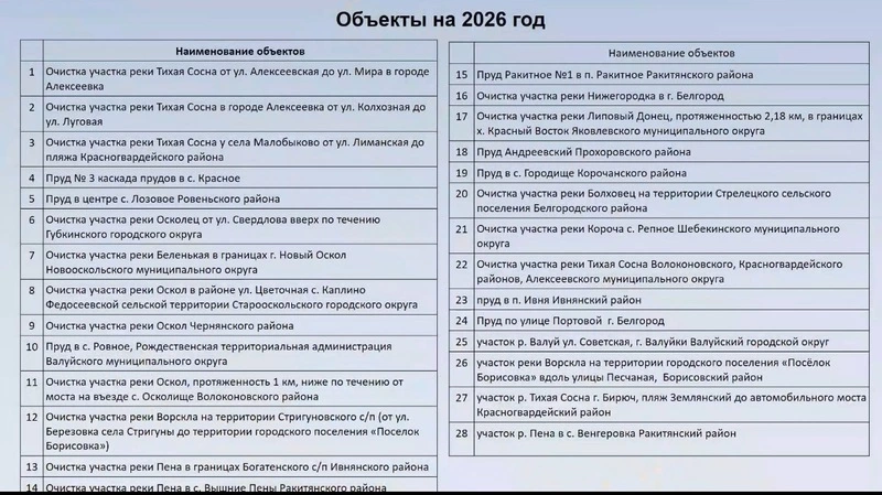 Три объекта перенесены на 2026 год. Участок реки Оскол в границах микрорайона Ливенка Чернянского района не был очищен из-за судебных разбирательств и проведения на объекте экспертиз. Работы на ручье в Нижнем Ольшанце перенесены из-за запланированного благоустройства. Очистка участка реки Нежеголь в одноимённом селе выполнена на 40%, дальнейшие работы в настоящий момент невозможны из-за сложной оперативной обстановки.