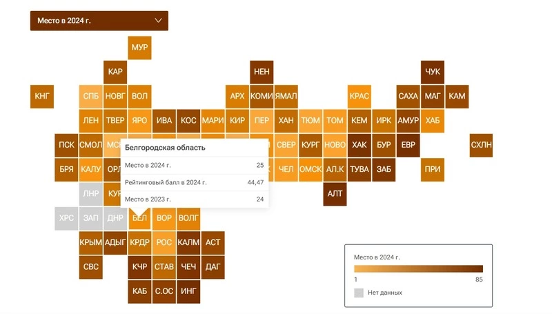 Тем временем Курская область опустилась с 38-го на 39-е место по итогам 2024 года. Липецкая область опустилась на три места и заняла 44-е место. Тамбовская область также потеряла три места и понизила свой рейтинг до 56-го места.
