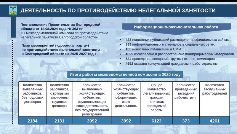 Первый замгубернатора сообщил, что в 2025 году межведомственная комиссия по противодействию нелегальной занятости выявила 2 184 неофициально работавших белгородцев и почти четыре тысячи предприятий без регистрации. Так, на фоне проверок свою деятельность официально оформили 2 184 человека и 3 992 работодателя. 45 должностных лиц привлечены к административной ответственности, трудовая инспекция вынесла 481 предостережение. По словам Пономарёва, работодатели увеличили фонд оплаты труда в два раза — до 100 млн рублей.