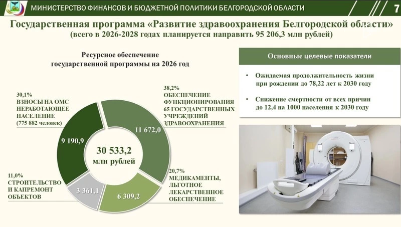 Прийти к ожидаемой продолжительности жизни населения в возрасте 78 лет белгородские власти планируют путём вложения средств на развитие медицины в регионе. Традиционно совершенствование системы здравоохранения уложится в рамки взносов на ОМС для неработающего населения, обеспечение функционирования медучреждений и их капитальный ремонт, а также закупку лекарств для льготных категорий граждан.