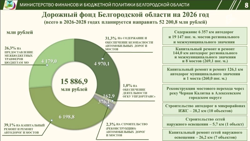 Капитальный ремонт дорог и мостов в Белгородской области составит 6,1 млрд рублей — 39,1% от общей заложенной на дорожное хозяйство суммы. Содержание дорог обойдётся властям в 4,9 млрд рублей, а вот на строительство новых дорог в бюджете региона на будущий год заложено только 376,1 млн рублей — 2,3%.