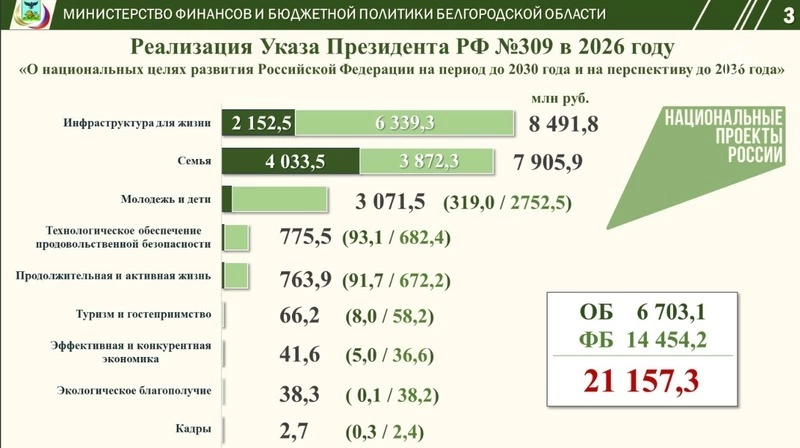 Несмотря на сложное финансовое положение, Белгородская область продолжит выполнять взятые обязательства по реализации национальных проектов. Так в 2026 году область направит 8,5 млрд рублей на проект «Инфраструктура для жизни», 7,9 млрд рублей на проект «Семья» и 7,9 млрд рублей на проект «Молодёжь и дети». Порядка 1,6 млрд рублей будет направлено на развитие других нацпроектов.