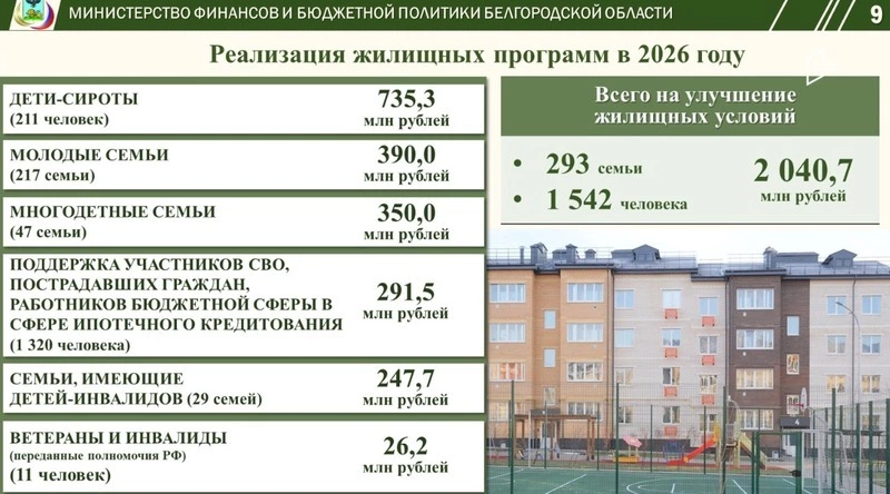 Развитие жилищного фонда, согласно прогнозам регионального министерства финансов, требуется в 2026 году порядка 2 млрд рублей. Новое жильё получат 211 детей-сирот, 217 молодых, 47 многодетных семей и 29 семей с детьми-инвалидами. Также регион окажет помощь участникам СВО, пострадавшим от атак ВСУ белгородцам и работникам бюджетной сферы — поддержку получат как минимум 1 320 человек. В 2026 году также будут улучшены жилищные условия 11 ветеранов и инвалидов.