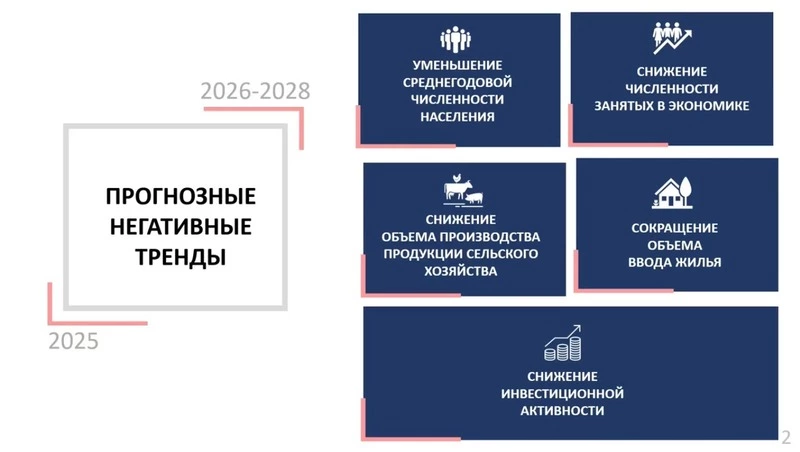 Среди негативных прогнозных трендов было названо уменьшение среднегодовой численности населения, снижение численности занятых в экономике, сокращение объёма ввода жилья и снижение объёма производства сельхозпродукции. Ведомства разработали план мероприятий, позволяющий скорректировать риски и выйти на хорошие показатели.