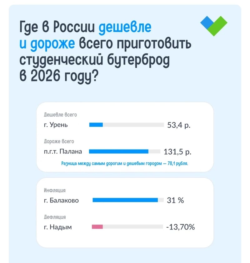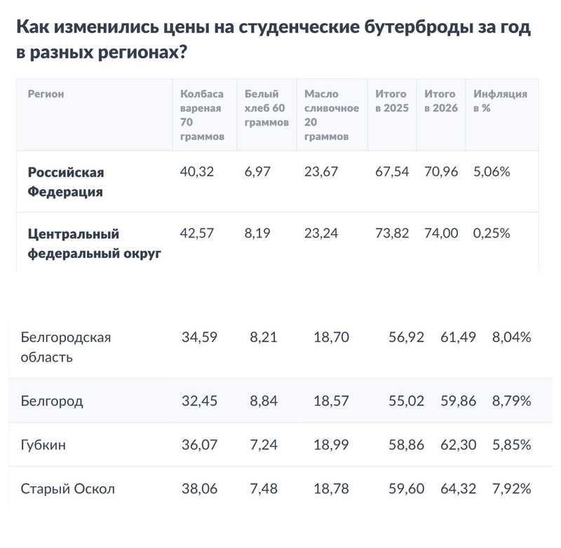 По России рост индекса студенческого бутерброда составил 5%. Приготовить два бутерброда в 2026 году обойдется почти в 71 рубль. Самая низкая стоимость, 53,4 рубля, зафиксирована в городе Урень Нижегородской области, самая высокая — 131,5 рубль, в посёлке Палана Камчатского края.