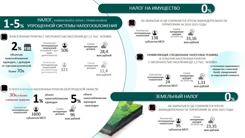 Новый пакет документов предлагает внести изменения в нормативно-правовые акты муниципальных образований, чтобы освободить от уплаты земельного налога юрлица — субъекты малого и среднего предпринимательства, которые работают на территориях с временно ограниченным доступом или сохраняющейся угрозой жизнедеятельности (на период 2024–2025 годов).