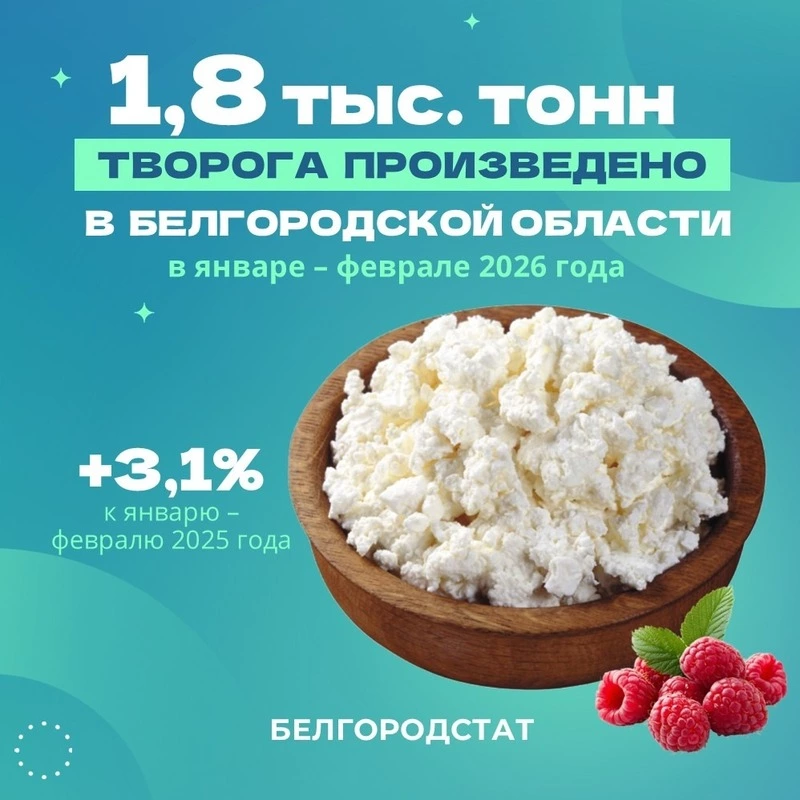 Белгородские предприятия за январь–февраль 2026 года произвели 1,8 тысячи тонн творога. Это на 3,1% больше по сравнению с аналогичным периодом прошлого года.