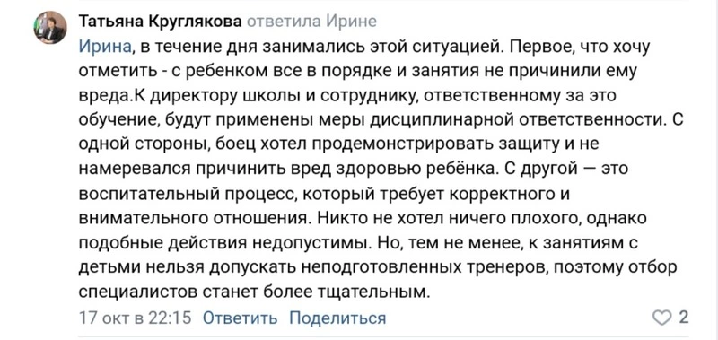 При этом глава подчеркнула неоднозначность ситуации. Несмотря на то, что инструктор руководствовался благими намерениями, демонстрируя приёмы самозащиты, любой риск для здоровья ребенка в воспитательном процессе является неприемлемым.