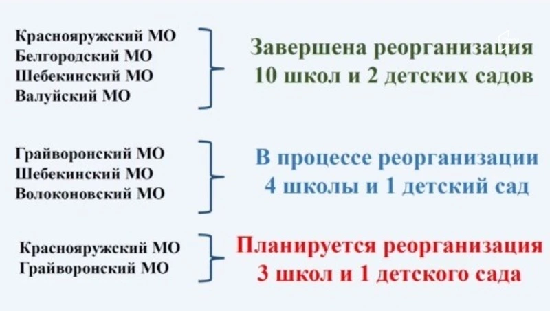 По словам министра образования, в Белгородском, Валуйском, Краснояружском и Шебекинском муниципальных округах завершена реорганизация 10 школ и двух детских садов, в Волоконовском, Грайворонском и Шебекинском мунокругах в процессе реорганизации четыре школы и один детсад. Кроме того, ещё планируется реорганизовать три школы и детсад в Грайворонском и Краснояружском округах.