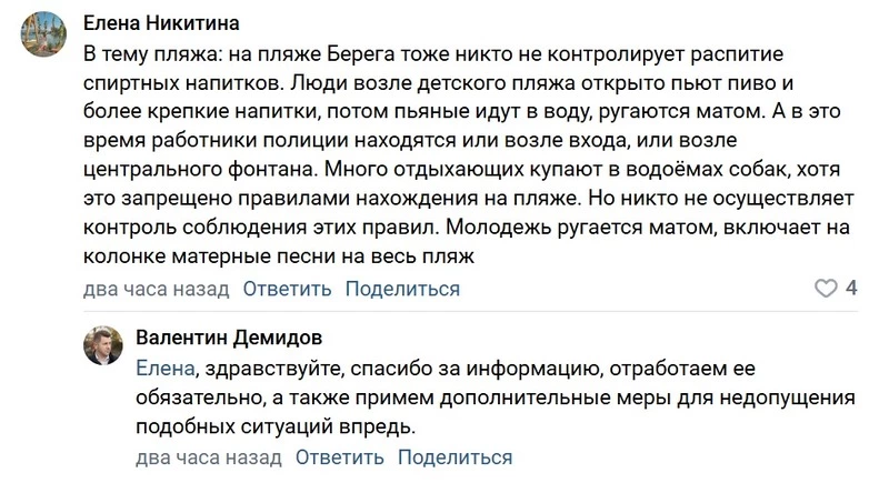 По её словам, на пляже часто собираются компании, которые пьют спиртное и пьяными идут купаться, ругаясь матом. Некоторые отдыхающие купаются с собаками, что запрещено правилами, а молодёжь через колонки слушает матерные песни. Такое поведение белгородцев не останавливает даже нахождение на пляже маленьких детей. Полиция, как уверяет женщина, дежурит у входа в парк и не следит за соблюдением порядка на берегу.