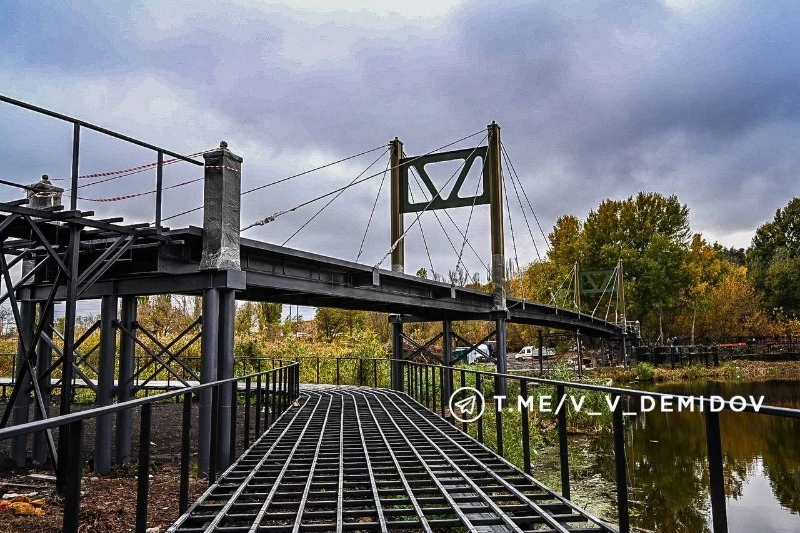 Строители завершили возведение металлических конструкций и натянули стальные тросы, поддерживающие пролёты моста. В ближайшее время начнётся укладка резинокордового настила и обустройство подхода к мосту, который будет оформлен террасной доской, придавая ему современный и стильный вид.