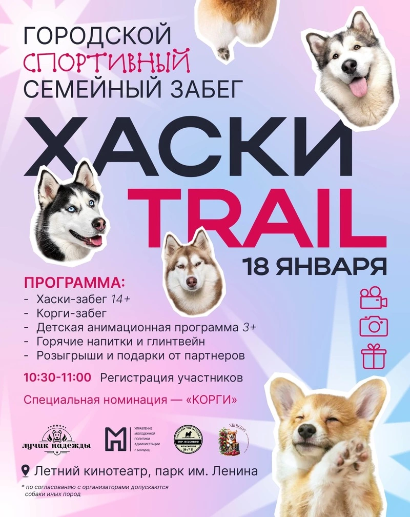 В «Хаски-забеге» с препятствиями на один километр могут принять участие мужчины и женщины. Маленьким корги предстоит соревнование на 20-метровой дистанции. Желающим пробежаться, у которых нет собак, управление молодёжной политики города предоставит в команду хаски. Победителей и участников ждут призы и подарки, зрителей — горячие напитки и развлекательная программа. Необходима предварительная регистрация.