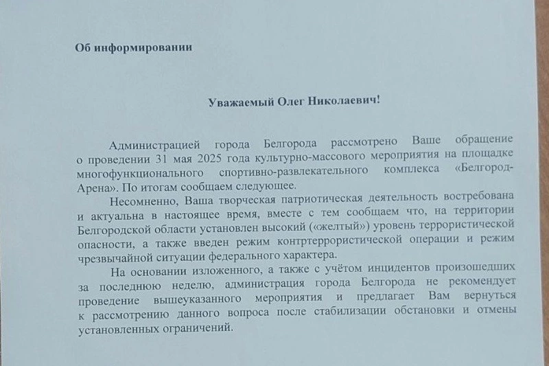 На странице рок-группы Radio Tapok снова появилось сообщение о переносе концерта с приложенным письмом от мэрии Белгорода, в котором городские власти советуют перенести выступление из-за жёлтого уровня террористической угрозы.