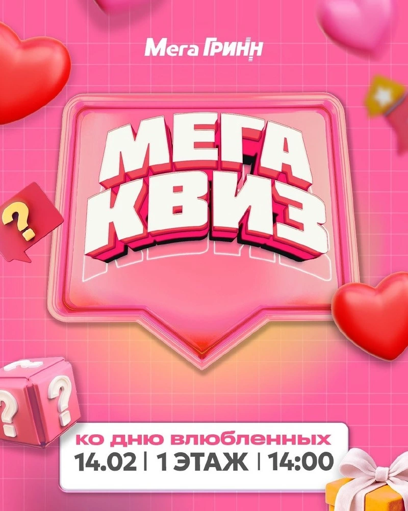 14 февраля в 14:00 ко Дню всех влюблённых ТЦ «МегаГРИНН» подготовил «МЕГА КВИЗ». Любителей командных игр приглашают на тематический квиз с романтическим настроением. К участию приглашаются команды от четырёх человек. Участие бесплатное, для регистрации необходимо до 10:00 14 февраля отправить организатору название команды, количество участников, имя и телефон капитана.
