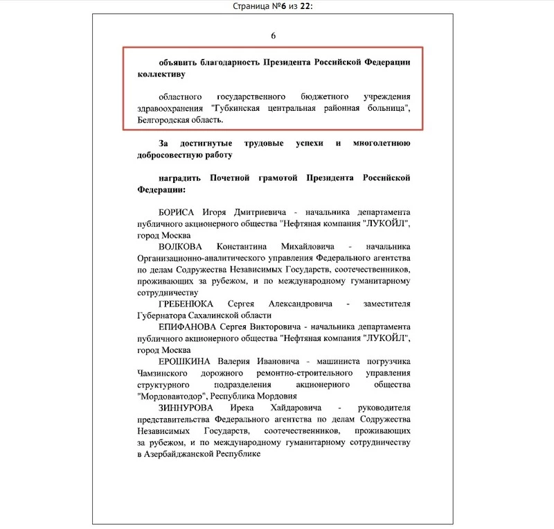Согласно документу, губкинские медики получили благодарность президента за высокий профессионализм и самоотверженность, проявленные при оказании медицинской помощи в экстремальных условиях. Вместе с белгородцами награду получили также сотрудники курских больниц.