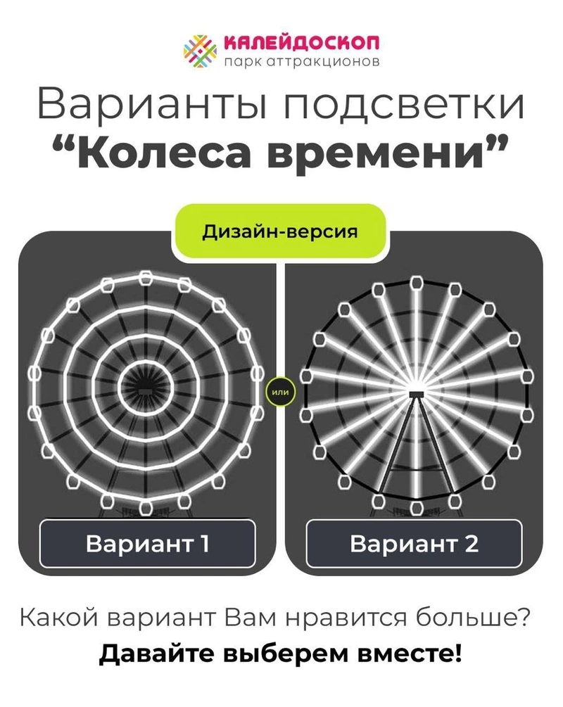Колесо обозрения в белгородском парке аттракционов «Калейдоскоп» засияет по-новому. Администрация парка приглашает белгородцев принять участие в голосовании за один из двух представленных вариантов подсветки.