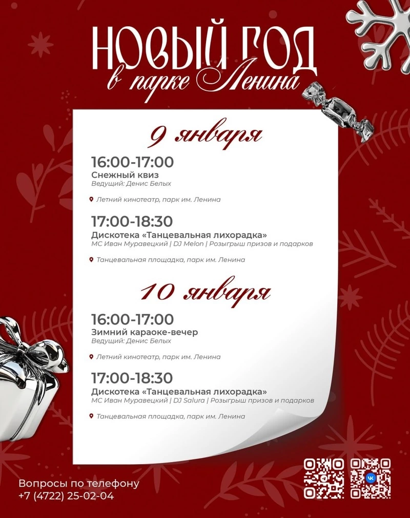 9 января в Центральном парке имени Ленина с 16:00 до 17:00 в летнем кинотеатре пройдёт «Снежный квиз». Для любителей песен в это же время и на том же месте, но уже 10 января пройдёт зимний караоке-вечер.