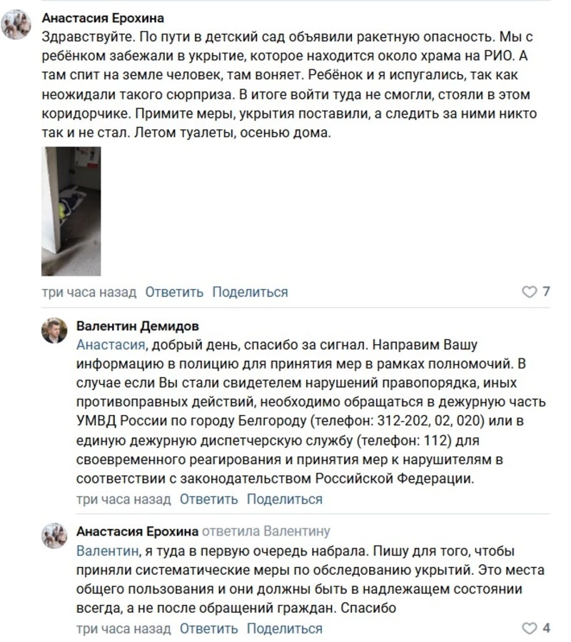 Мэр Валентин Демидов в ответ на сообщение женщины заверил, что направит информацию о спящем в неположенном месте мужчине в полицию, однако такой ответ белгородку не удовлетворил. По её словам, укрытия должны содержаться в чистоте всегда, а не только после жалоб горожан. На это замечание градоначальник уже не ответил.