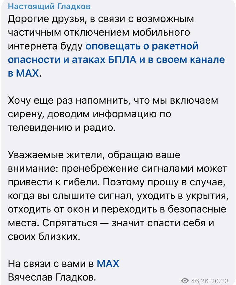 Работа мобильного интернета в Белгородской области может быть снова ограничена. Об этом сообщил губернатор региона Вячеслав Гладков, напомнив, что оповещение о ракетной опасности и угрозе БПЛА белгородцы всегда могут получить по телевидению и радио. Привычные оповещения из телеграм-канала губернатора об угрозе атаки БПЛА и ракетной опасности теперь будут транслироваться в канале губернатора в мессенджере МАХ.