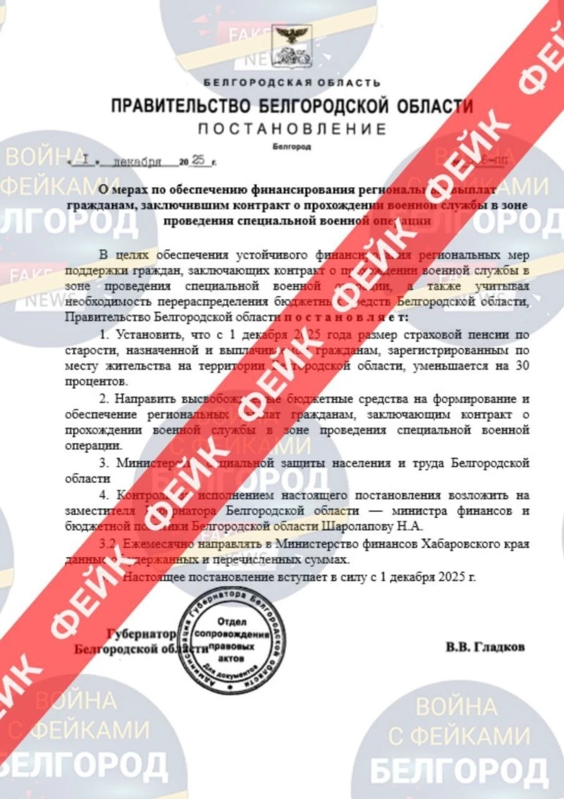 Telegram-канал «Война с фейками. Белгород» опубликовал пост с разоблачением нового фейка ЦИПсО, в котором говорится, что с 1 декабря пенсии белгородских пенсионеров будут урезаны на 30%, чтобы дополнительно спонсировать региональные выплаты для ветеранов СВО.