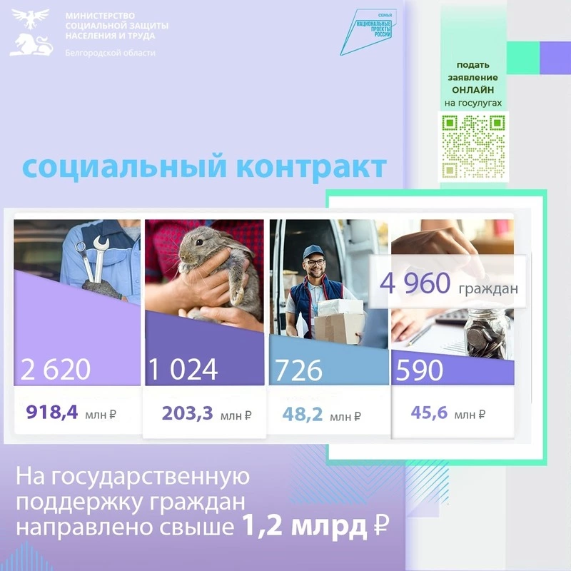 Свыше 2,6 тысяч жителей Белгородской области заключили социальные контракты. Около 1,1 тысяч белгородцев получили финансовую поддержку для развития личного подсобного хозяйства, а 726 безработных обратились за помощью в трудоустройстве при содействии служб занятости. Информацию предоставило региональное Минсоцтруда.