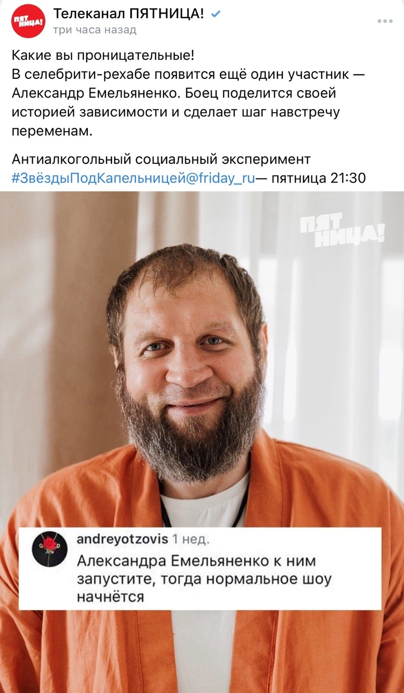 Белгородский боец Александр Емельяненко примет участие в телешоу «Звёзды под капельницей», показ которого начнётся на канале «Пятница» 14 ноября. Об этом сообщили в пресс-службе канала.