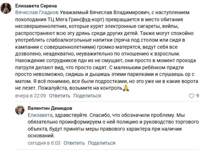 Белгородка отмечает, что присутствие сотрудников подразделения по делам несовершеннолетних не оказывает должного влияния: подростки просто меняют поведение на время, когда рядом патруль. Кроме того, в ТЦ невозможно прийти в торговый центр с маленьким ребёнком — приходится дышать паром от электронных сигарет и слушать нецензурную брань, добавила местная жительница.
