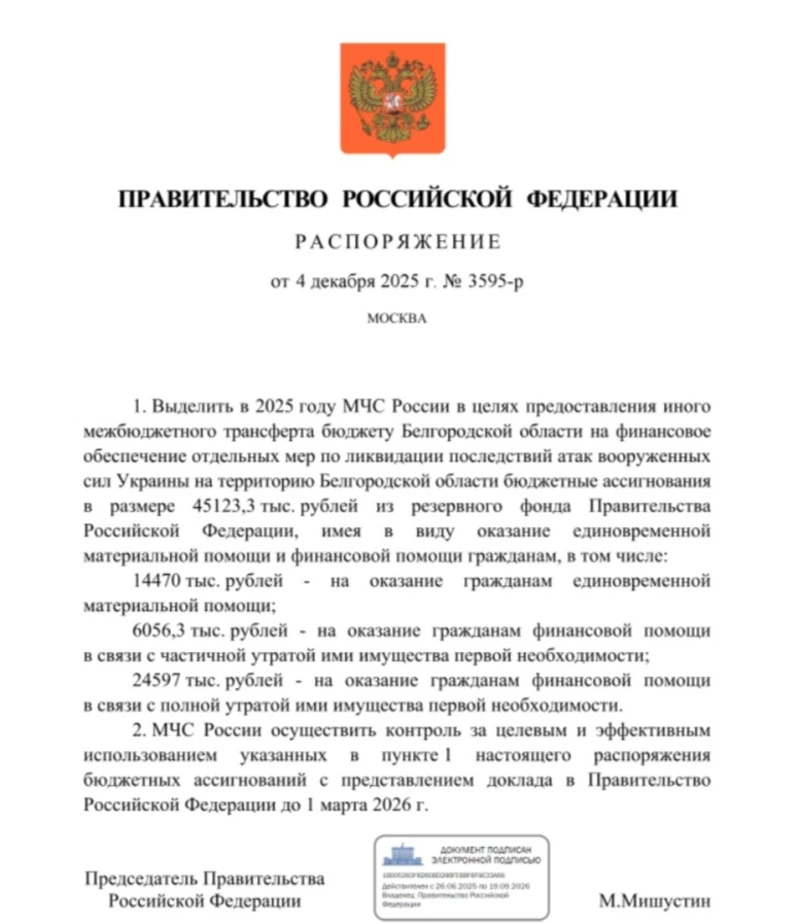 Правительство РФ выделило более 45 млн рублей на помощь белгородцам, потерявшим жильё из-за атак ВСУ. Распоряжение опубликовано на портале правовых актов.