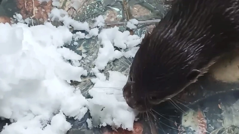 Кипер Мария принесла в экзотариум к своим подопечным немного выпавшего в Белгороде снега, который выдры сначала приняли за еду. Однако вскоре маленькие представители куньих начали с ним играть.