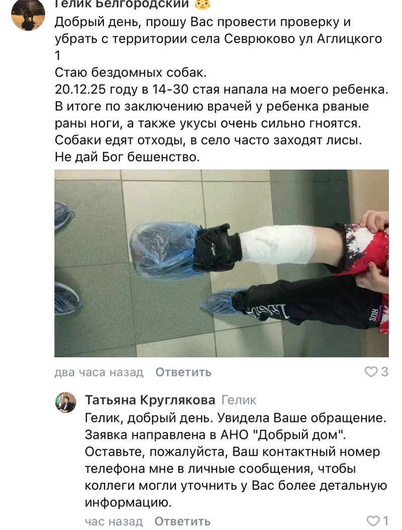 По словам женщины, ребёнок получил рваные раны ноги после нападения собак на улице Аглицкого в воскресенье днём. Мальчику потребовалась медицинская помощь. Автор обращения просит отловить животных, которые могут быть заражены бешенством.
