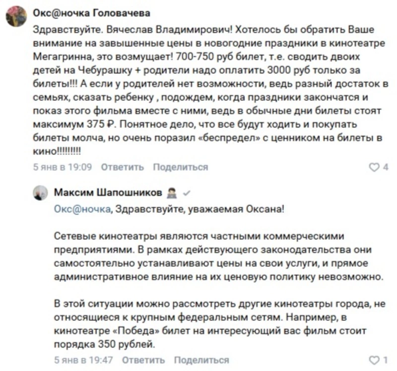 Отреагировавший на обращение белгородки министр культуры Белгородской области Максим Шапошников пояснил, что «Гриннфильм» является частным кинотеатром, администрация которого самостоятельно устанавливает цены. Чиновник порекомендовал местной жительнице обратить внимание на другие кинотеатры, где цены на билеты более приемлемые.