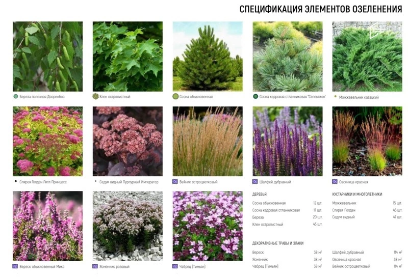 В рамках озеленения территории планируется высадить около 80 деревьев клёна, берёзы и сосны, а также более ста кустов можжевельника, спиреи и седума. В клумбах будет расти шалфей, чабрец, лаванда, овсяница. На участке также посеют газон.