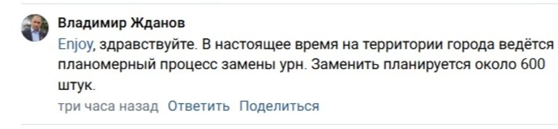 Глава округа Владимир Жданов сообщил, что в городе идет процесс обновления урн — планируется заменить около 600 штук.