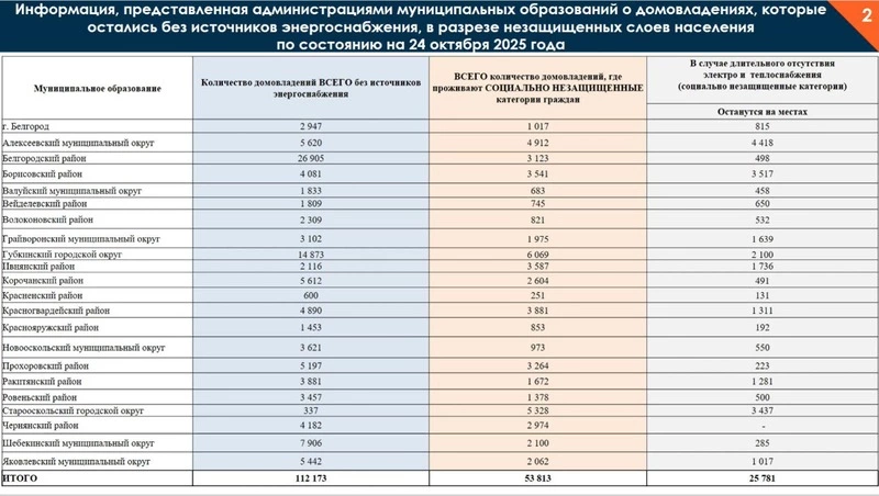 Замгубернатора подчеркнул, что первоначальная информация была некорректной. Число незащищенных граждан уменьшилось с 25 803 до 6 803 тысячи человек, однако готовность к предоставлению альтернативных источников энергии — генераторов и печей-буржуек — была подтверждена лишь двумя муниципалитетами: Новооскольским и Ровеньским. На данный момент почти семь тысяч белгородцев остаются уязвимыми перед перебоями в электроснабжении. Остальные муниципалитеты заявили о готовности предоставить транспорт для эвакуации в пункты временного размещения или к родственникам.