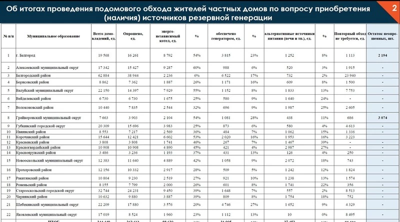 Довгалюк подчеркнул, что после повторной проверки информации выяснилось, что практически все районные администрации предоставили неверные данные, из-за чего численность незащищённой категории граждан уменьшилась с 25 781 человека до 6 803. По словам замгубернатора, только Новооскольский округ и Ровеньский район готовы предоставить населению генераторы и печи-буржуйки, остальные муниципалитеты могут только перевезти людей в ПВРы других районов или к родственникам.