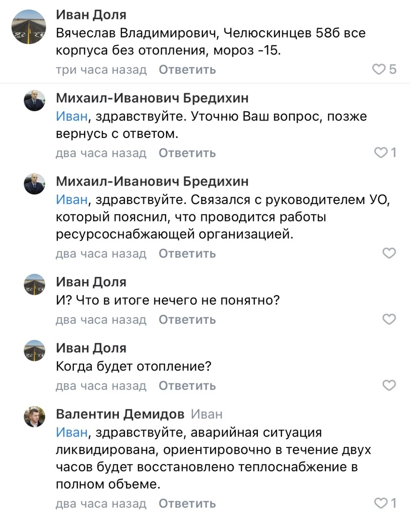 Мэр города Валентин Демидов сообщил, что в городе произошла аварийная ситуация, которую уже ликвидировали, и заверил, что теплоснабжение будет полностью восстановлено до 11:00.
